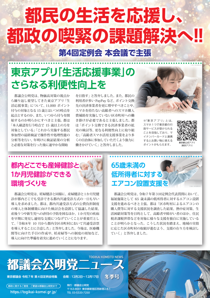都議会公明党ニュース(2025冬季号) 2025.12.18 以下のリンクをクリックすると、定例会のPDFがダウンロードできます。都議会公明党ニュース 2025 冬季号 この記事に関するお問合せは 都議会公明党 TEL:03-5320-7250 まで